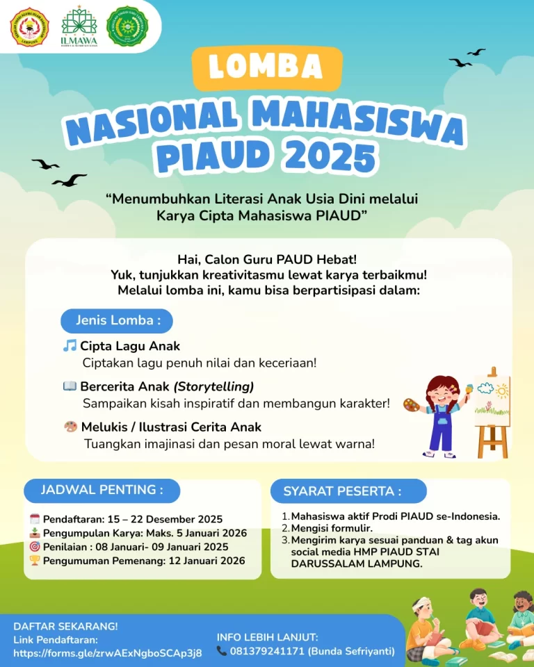🎉 LOMBA NASIONAL MAHASISWA PIAUD 2025 🎶🎨📖 📘 “Menumbuhkan Literasi Anak Usia Dini melalui Karya Cipta Mahasiswa PIAUD” Hai, para guru& calon guru PAUD hebat!Yuk, tunjukkan kreativitasmu lewat karya terbaikmu!Literasi anak bukan sekadar membaca dan menulis, tapi juga tentang berkreasi, mengekspresikan, dan memahami dunia dengan gembira. Melalui lomba ini, kamu bisa berpartisipasi dalam: 🎵 Cipta…